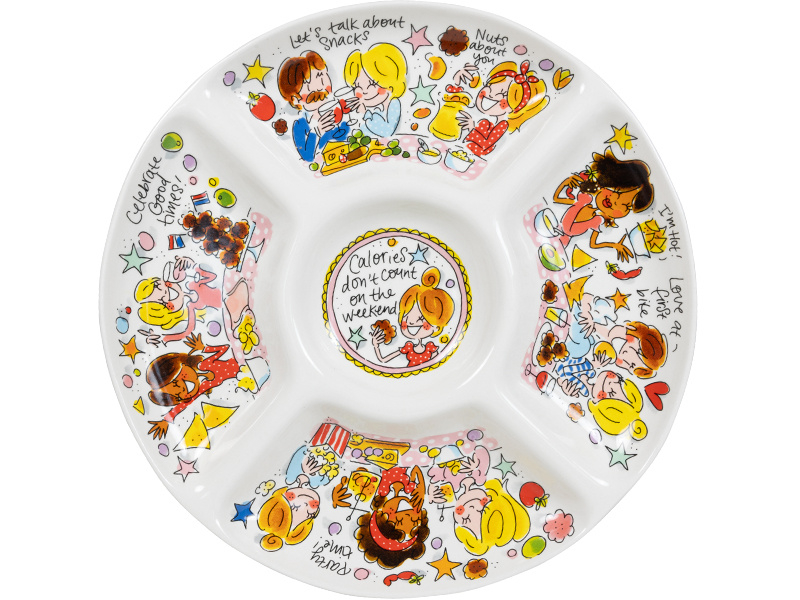 OverzichtDeze vrolijke en kleurrijke snackschaal chips & dips maakt jouw tafel nog gezelliger! De opvallende en kleurrijke illustraties kenmerken de ‘Even bijkletsen’ lijn van de twee vriendinnen uit Amsterdam: een servieslijn met een knipoog. Het ‘Even bijkletsen’ servies, waar Femque en Janneke bekend mee zijn geworden, bestaat o.a. uit kop en schotels, borden, petitfours en theepotten. Om de lijn compleet te maken is er nu ook een snackschaal om de lekkerste borrelhapjes mee te serveren.